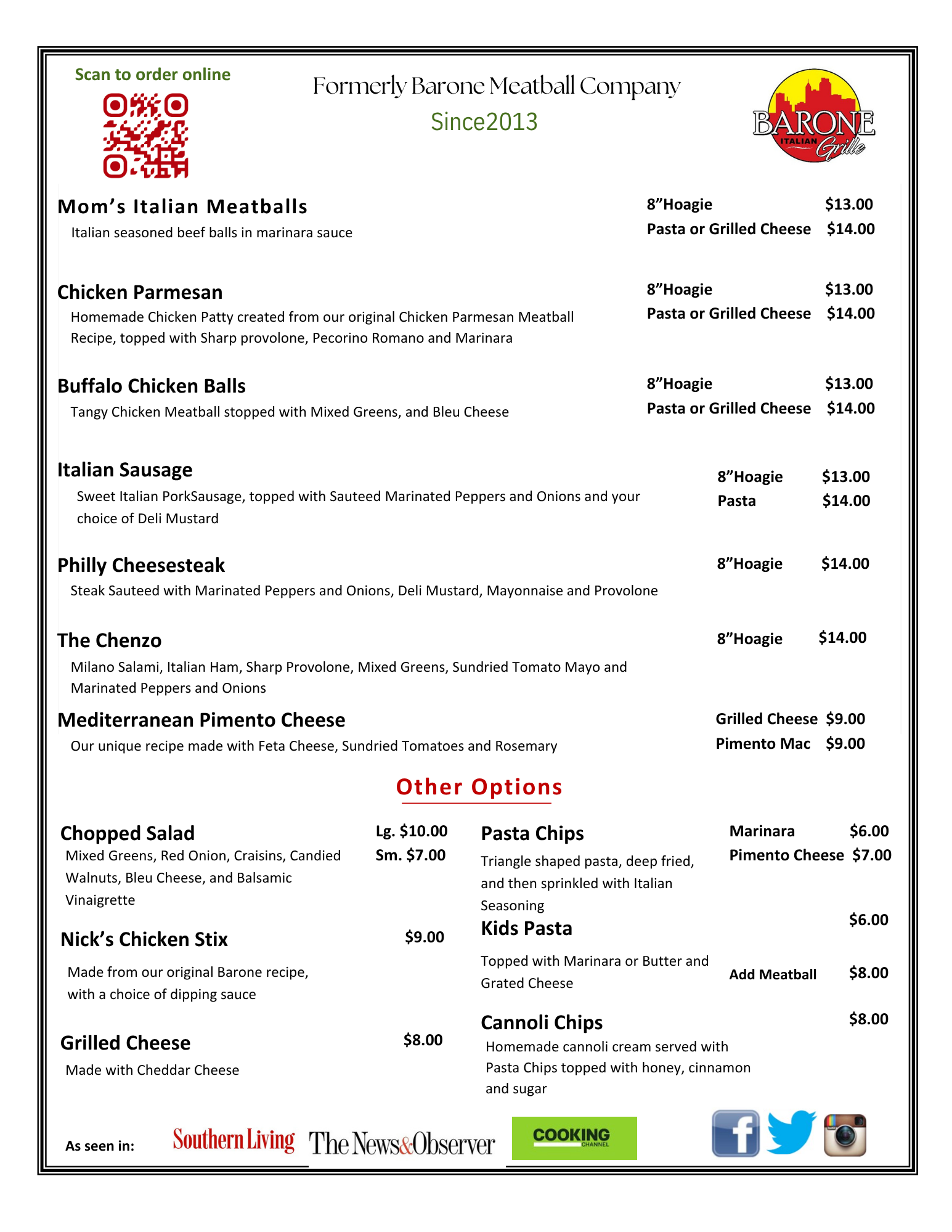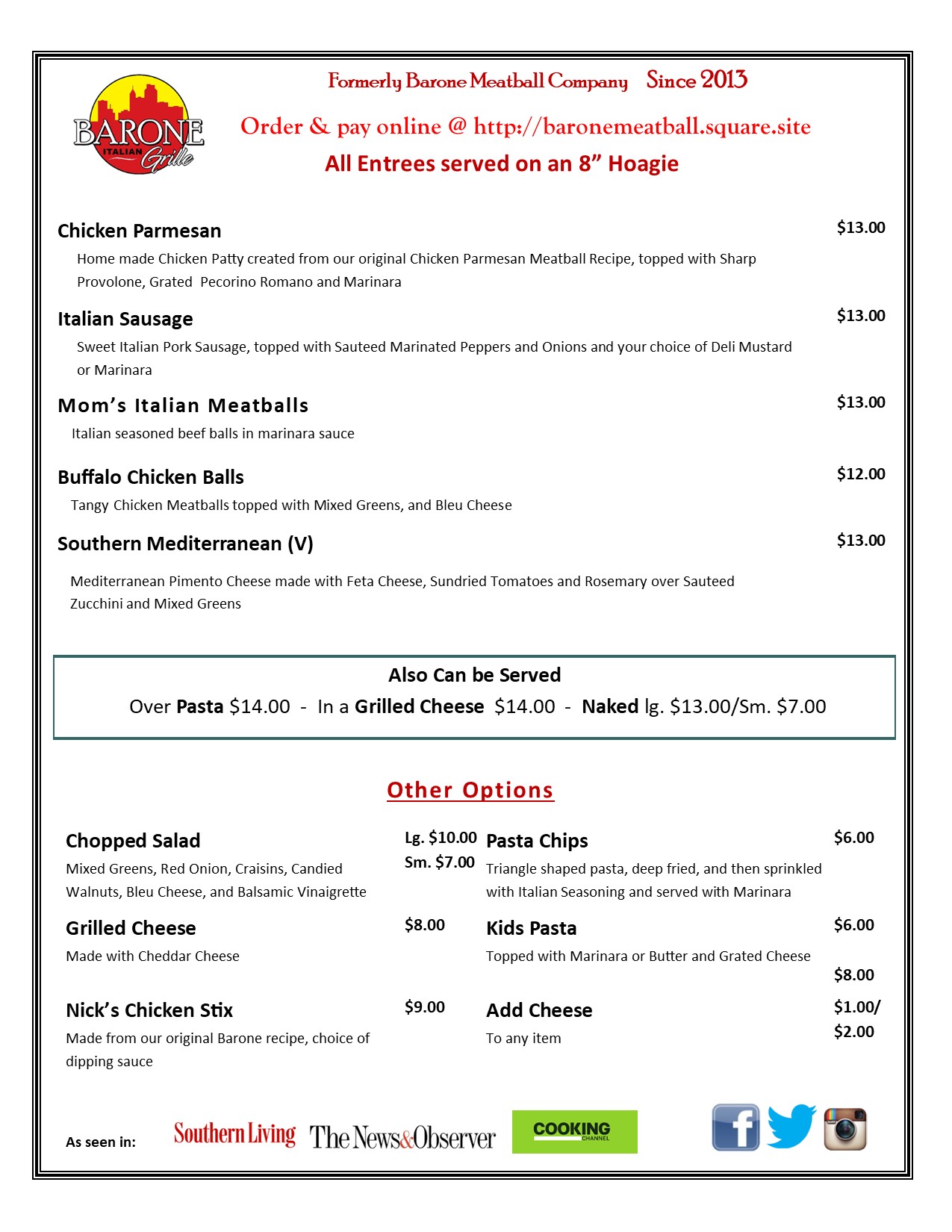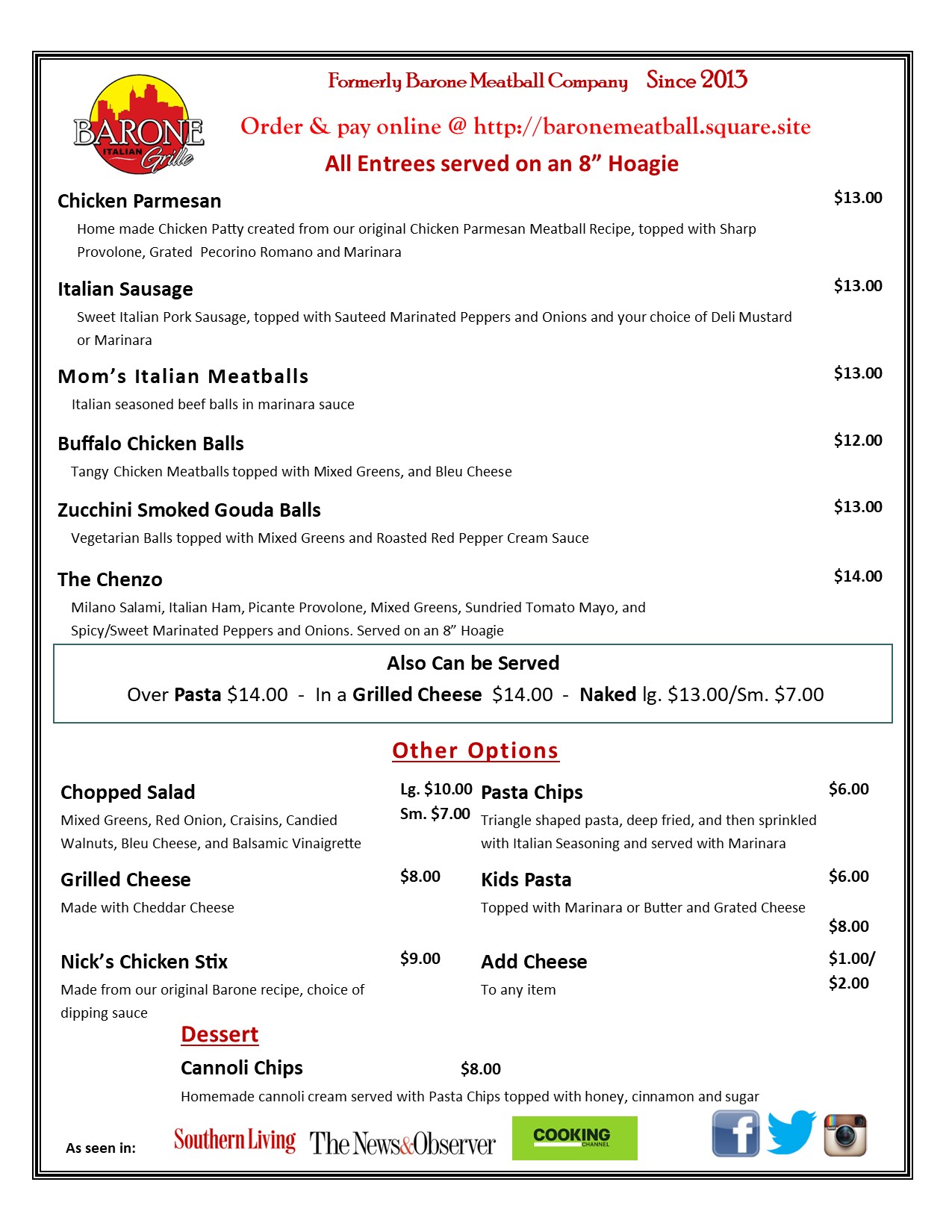 We have had many different ball choices over the years while we served the Triangle Area as Barone Meatball Company. To check out a list of those along with some of the other menu items we have had or could soon have as a Special, please go to our Full Menu page.